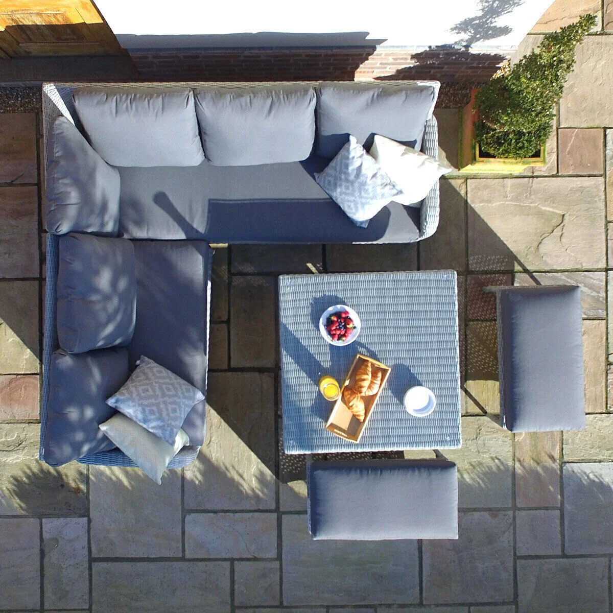Ascot Square Corner Dining Set with Rising Table considers the smaller outdoor living space, compact and symmetrical for any corner of your home. The central dining table offering the option to move from day-time lounging to evening alfresco dining. The square rising table simply lifts from coffee to dining table positions teamed with the popular corner sofa group, and long footstools to maximise use and seating space. The cushions in the Ascot range are coated internally with a water-resistant liner to prevent water permeation. Whilst the outer covers will retain water, they quickly dry in warm weather, so you won’t need to hurriedly collect them in any unexpected UK showers. We do, however, advise that during prolonged periods of non-use or poor weather that the cushions are stored indoors.