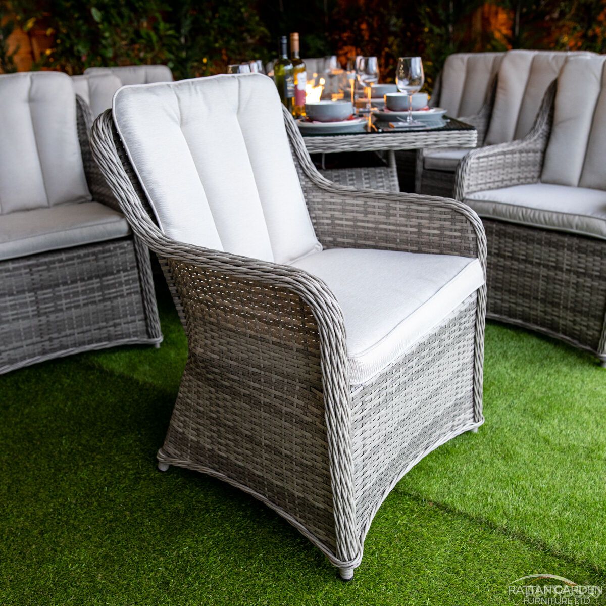 Our new luxurious Gas Fire Pit Dining Range is exclusive to Rattan Garden Furniture. An addition to our contemporary Champagne range is this Vienna 8 seat fire pit set. Imagine being able to spend hours entertaining guests and friends long into the evening with the warm glow of the fire pit. Relax in the garden all year round when the weather is cooler you can still enjoy your outdoor living space. The central focal point is the integrated fully adjustable gas-operated fire pit with its removable safety glass which helps shield the flames from windy conditions. In the base of the handwoven table is a concealed compartment for storing the gas bottle, keeping it out of sight but also making it easily accessible. Our tables have a deep woven edge and this set with 8mm tempered glass top. Our Champagne Range is handmade using a mix of cream and grey premium quality HDPE rattan which is hand-woven over heavy-duty aluminium frames allowing you to leave this furniture outside all year round without it going rusty, fading, or becoming brittle. Our gas fire pits are all CE registered. The fire pit is made using a premium quality mix of 304 and 210 stainless steel to withstand all weather conditions and will radiate heat up to 12Kw.