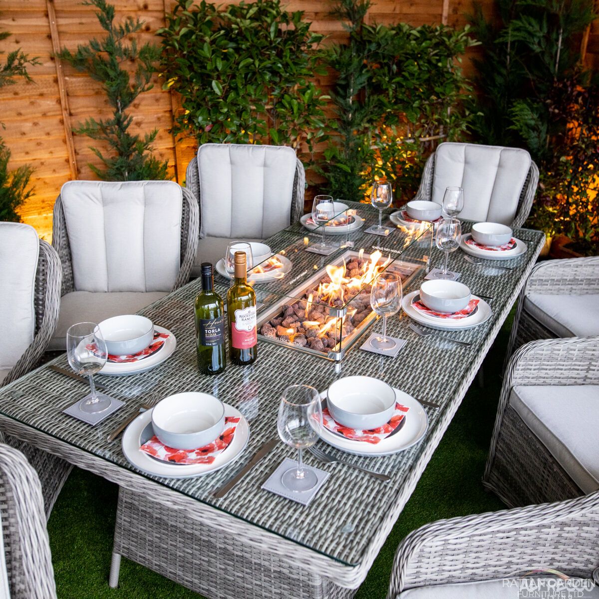 The Champagne Vienna 8 Seat Fire Pit With 210cm Rectangular Table comes in Light Grey Tonal 5mm Rattan over a Rust-Proof Aluminium Frame.