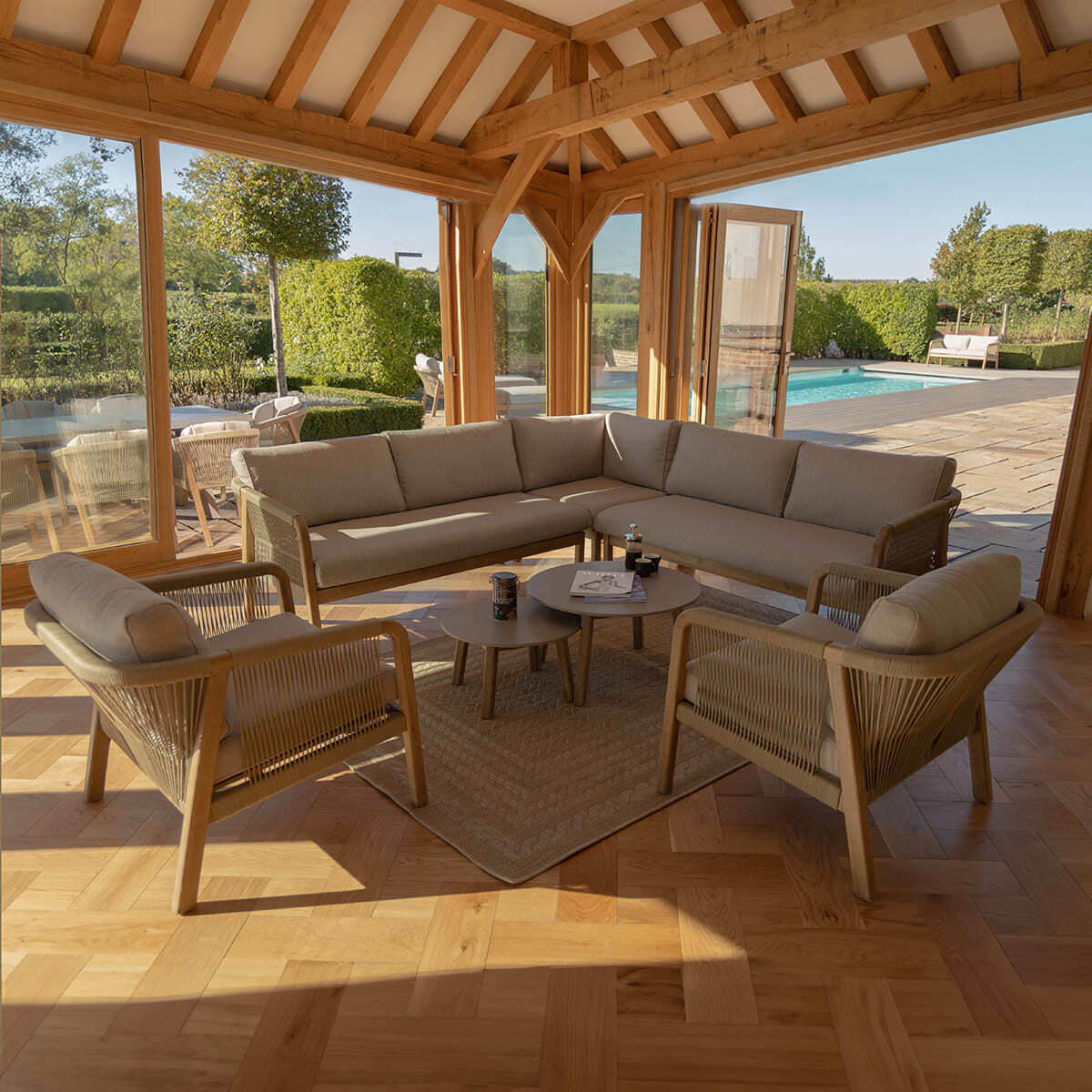 Create a haven of relaxation in your outdoor sanctuary with our Martinique Corner Sofa Set with 2 Lounge Armchairs. This meticulously designed garden furniture set brings together contemporary elegance and unparalleled comfort, transforming your outdoor space into a stylish retreat. This meticulously crafted corner sofa set features light brown antique finish acacia wood accents, all-weather rope weave, and plush 10cm thick cushions, creating a stylish and inviting retreat for both casual lounging and entertaining.