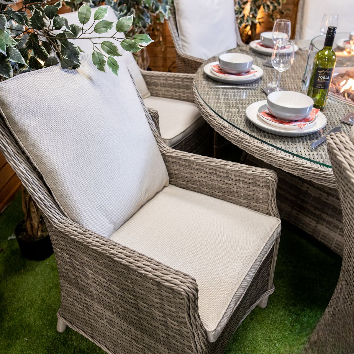 This gorgeous set offers all year round entertaining making it the ideal garden furniture piece. The stunning dining set boasts a large rectangular fire pit in the center of the glass table with adjustable heat. There is plenty of space to dine using the table, but the fire pit adds something special to the furniture which ultimately allows you to keep your guests warm all evening. The Champagne Paris Chairs have an upright style to them, providing comfort and support.