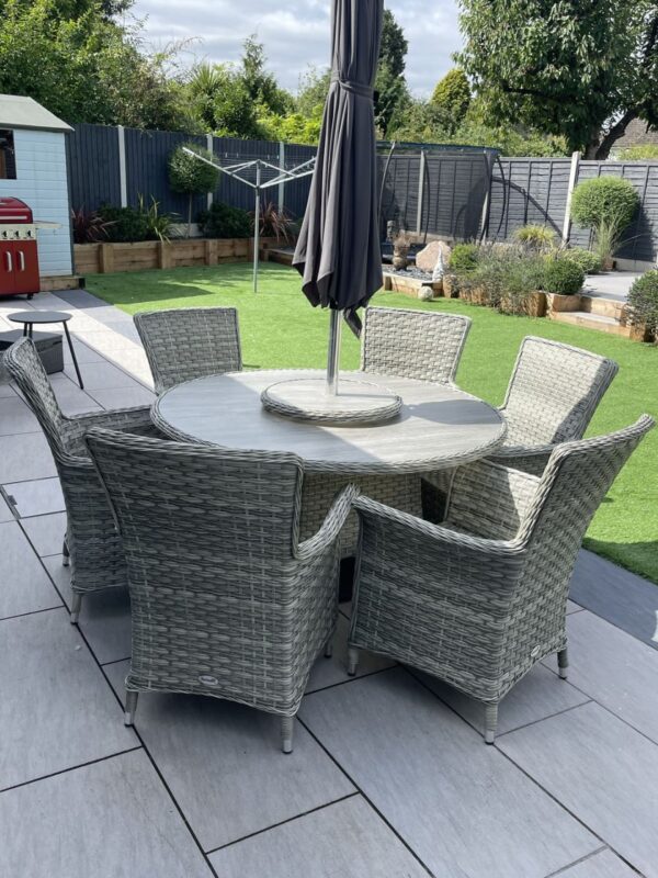 - The Victoria 6 Seat Round Dining Set with Square Chairs is the ideal way to incorporate class and elegance to your al fresco dining. The round table, topped with toughened glass, is complemented with six stylish high back dining chairs complete with base and back cushions to make this the peak of indulgence. Purchase our round 2.7M grey parasol to match your dining set, the table comes with a parasol hole for you to be able to relax longer in the summer sun.