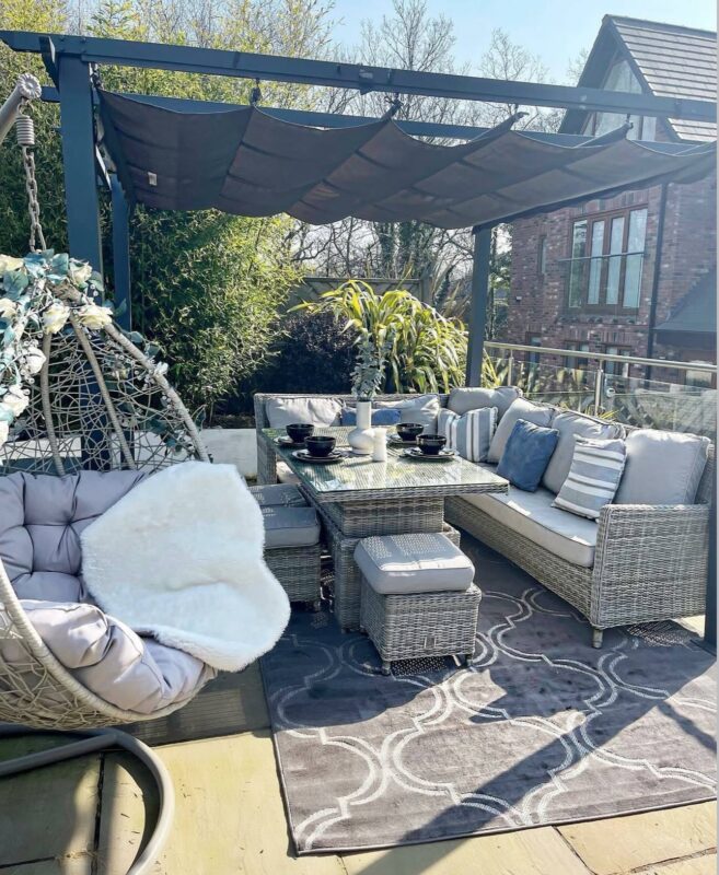 This patio set is a dream! The corner sofa is super comfy, the table is the perfect size for meals or drinks, and the overhead canopy gives just the right amount of shade.